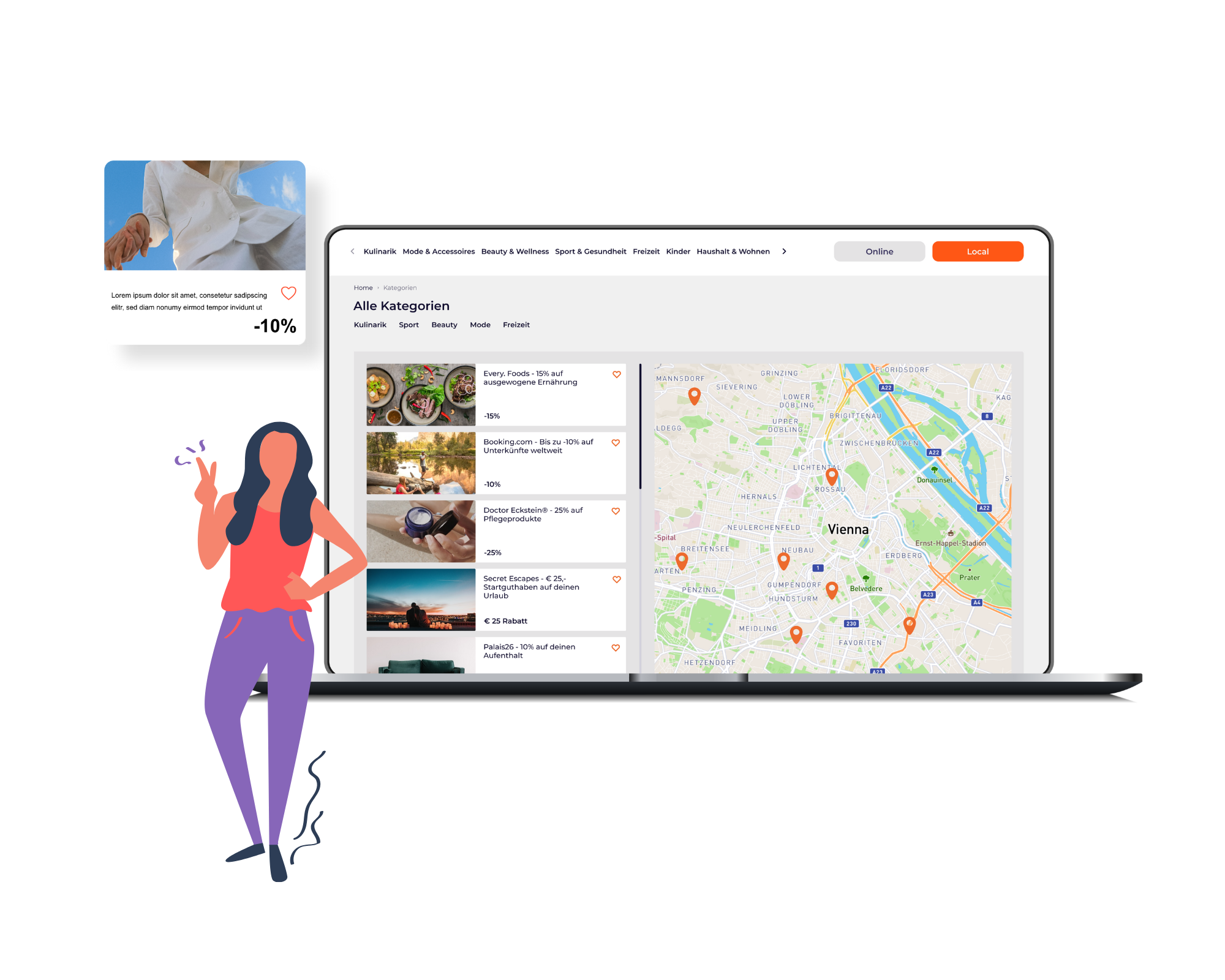Beim Einkauf vor Ort finden die User mit der GPS-Suchfunktion dein Angebot in ihrer Nähe, besuchen dein Store und lösen den Rabatt an der Kassa ein. Beim Online-Einkauf wählen die User dein Angebot aus, kopieren den Rabattcode und werden sofort in deinen Onlineshop weitergeleitet.